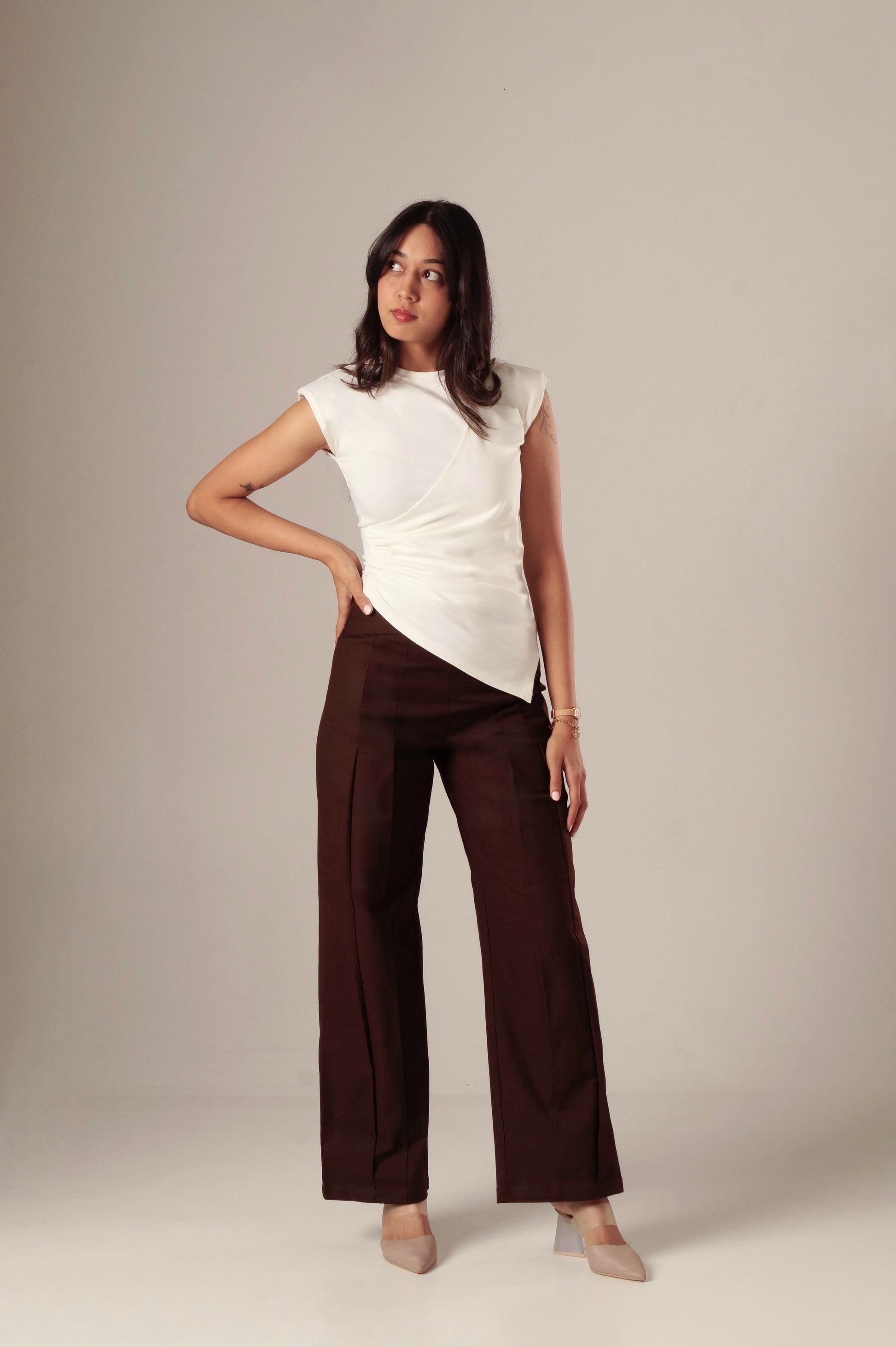 Featuring subtle shoulder pads and an asymmetric drape that flatters your natural shape, this top brings quiet confidence to any look.